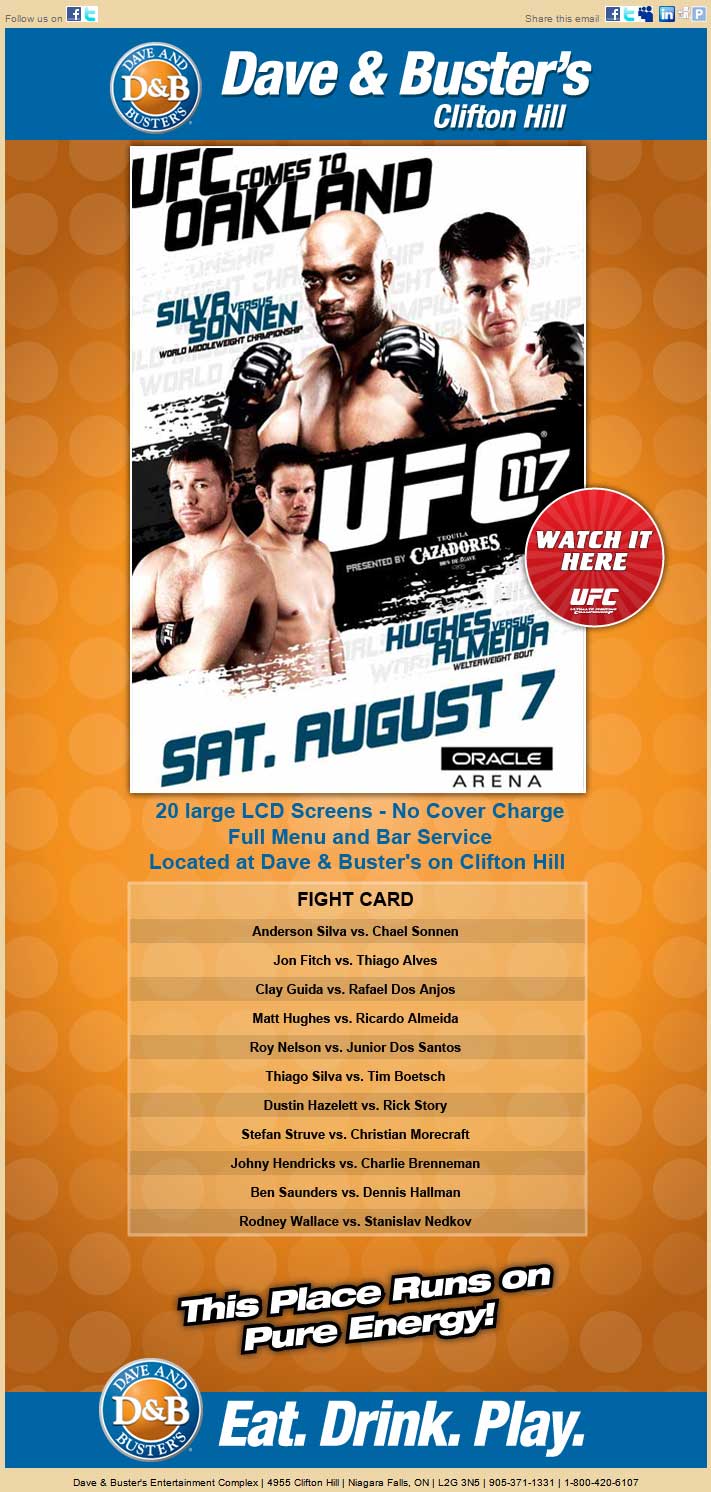 Yesterday I received this email newsletter from the Dave & Buster’s on Clifton Hill. Once again they are promoting a UFC fight.